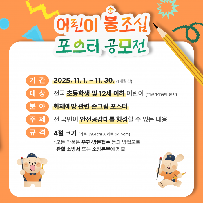 담양소방서(서장 이중희)는 11월 ‘불조심 강조의 달’을 맞아 어린이들에게 화재예방의 중요성을 알리고 안전문화 확산을 위한 ‘2025년 어린이 불조심 포스터 그리기 공모전’을 개최한다고 밝혔다.