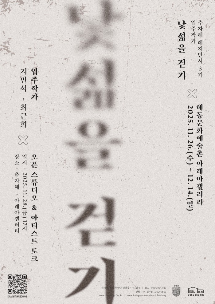 담양군문화재단(이사장 정철원, 이하 재단)은 추자혜 레지던시 3기 입주작가 결과발표전시 <낯섦을 걷기>가 오는 11월 26일부터 12월 14일까지 19일간 해동문화예술촌 아레아갤러리에서 열린다고 밝혔다.