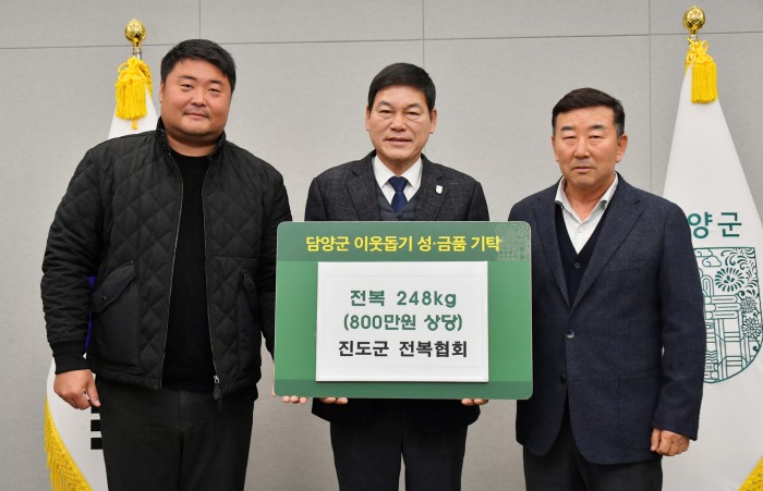 담양군에 따르면, ㈜글로벌이지스(대표 배범삼)에서 자동소화 멀티탭 312개(1,200만 원 상당), 진도군 전복협회(대표 김종석)에서 전복 248kg(800만 원 상당을 기탁했다.