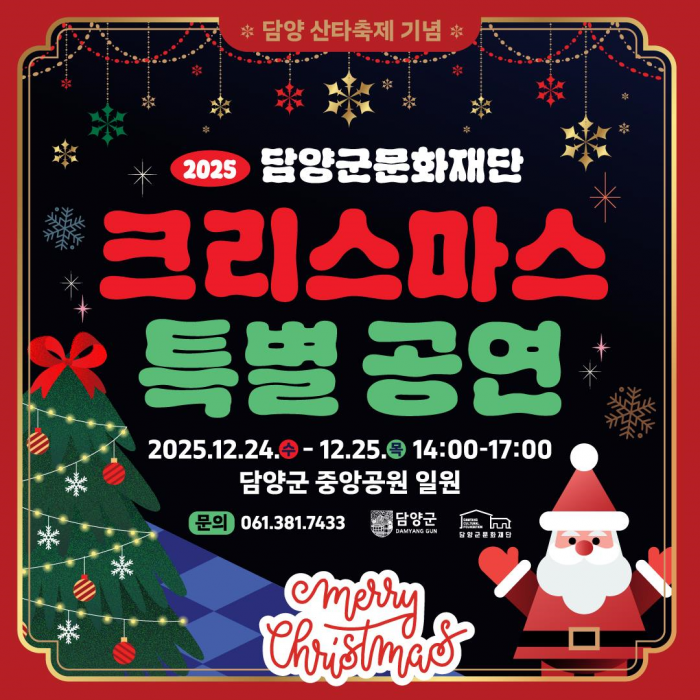 담양군문화재단(이사장 정철원)은 연말연시를 맞아 ‘제7회 담양산타축제’와 연계한 ‘2025 크리스마스 특별 공연’을 12월 24일부터 25일까지 이틀간 담양읍 중앙공원 일원에서 개최한다.