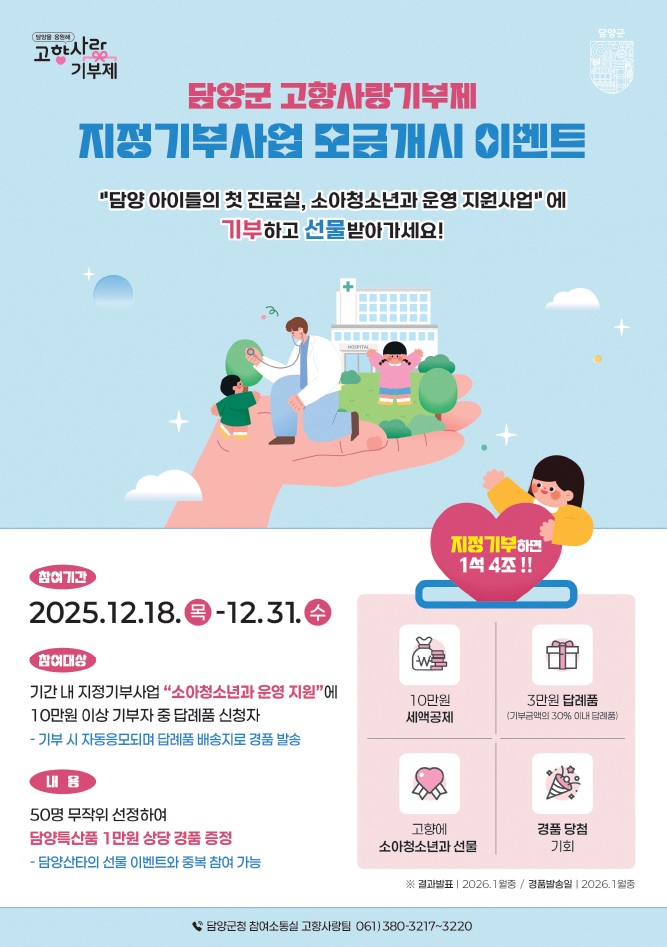 - 담양산타의 선물 및 소아청소년과 지정 기부 이벤트 등 혜택 풍성