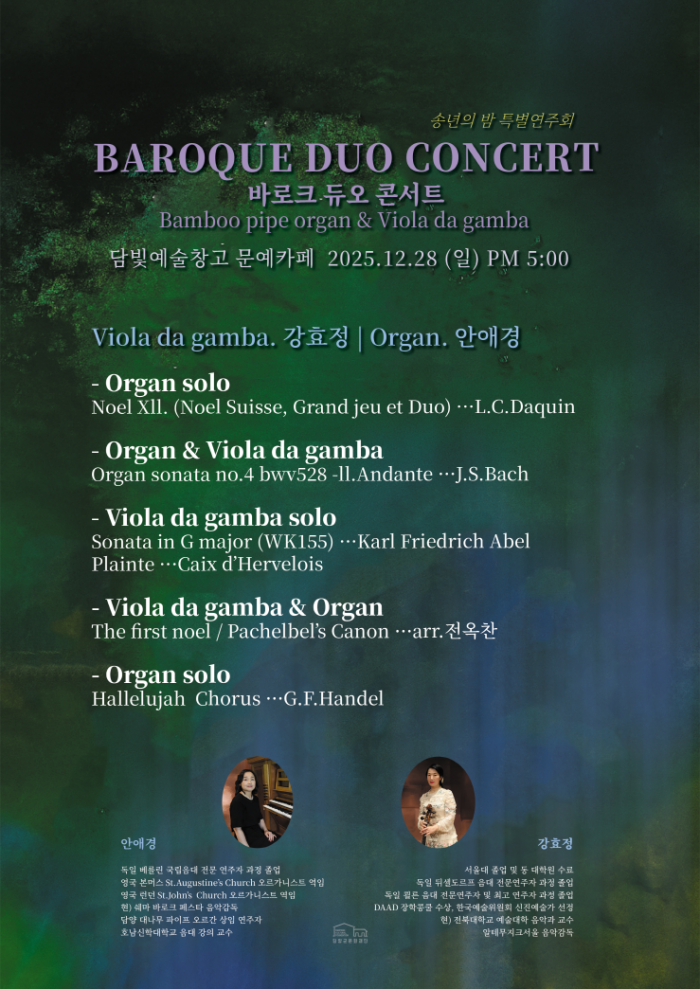 이번 공연은 2015년부터 꾸준히 진행해 왔던 담빛예술창고 대나무 파이프 오르간 정기연주회의 일환으로, 한 해를 마무리하는 의미에서 바로크 시대의 대표적 악기인 비올라 다 감바와 듀오 콘서트 형식을 빌어 서정성과 장엄함의 조화로움을 선사할 예정이다.
