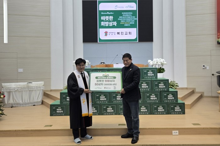 담양군(군수 정철원)은 담양읍 복민교회와 희망친구 기아대책이 겨울철 한파에 취약한 이웃을 위해 따뜻한 ‘희망상자’ 50개(500만 원 상당)를 기탁했다고 밝혔다.