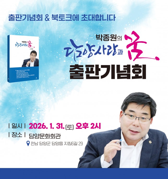 지역구 박종원 도의원이 오는 1월 31일(토) 오후 2시 담양문화회관에서 저서 『박종원의 담양사랑과 꿈』 출판기념회를 개최한다.