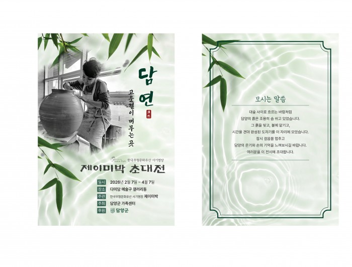 담양군가족센터(센터장 이예후)는 오는 2월 7일부터 4월 7일까지 59일간 다미담예술구 문화전시관(담양읍 담주4길 24-27)에서 한국 무형문화유산 사기 명장 ‘제이미 박‘의 도자기 초대전 ‘담연(潭然)’을 개최한다고 28일 밝혔다.