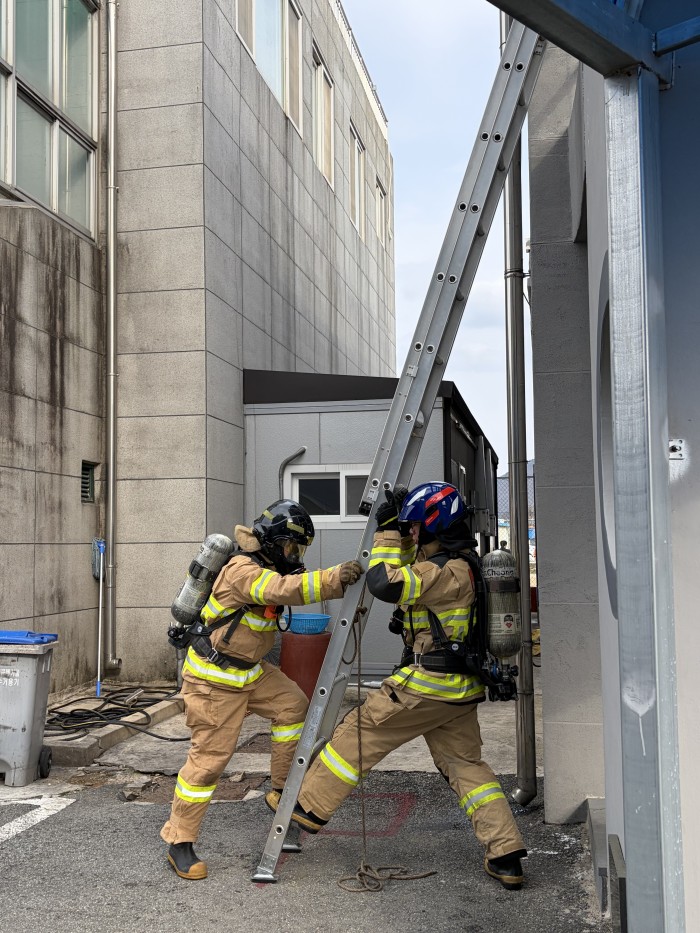 주요 훈련 내용은 ▲화재진압 전술 단계별 반복 숙달 훈련 ▲복식사다리 활용 건물 진입 및 화재진압 훈련 ▲고립 소방관 구조 전술 훈련 ▲개인별 체력 강화 ▲훈련 영상 분석을 통한 전술 피드백 등이다.