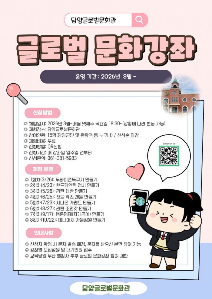 담양군이 지난해에 이어 올해도 3월부터 12월까지 매월 마지막 주 목요일에 담양글로벌문화관에서 ‘글로벌 문화강좌’를 운영한다.