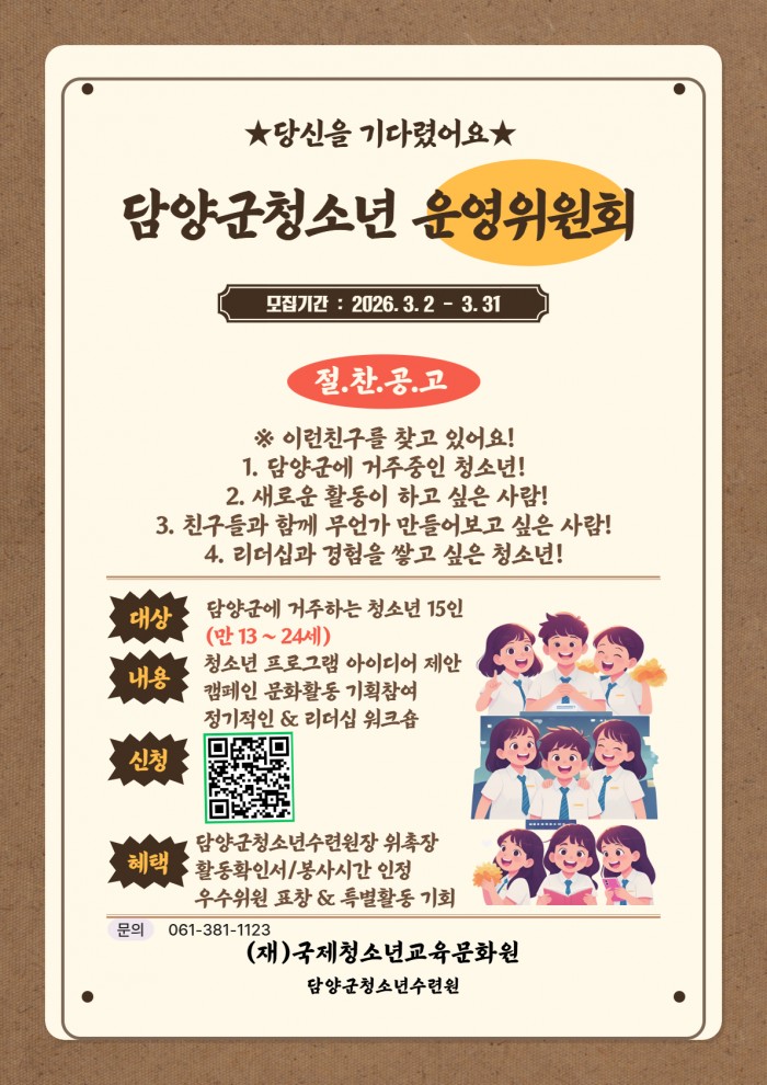 담양군청소년수련원이 청소년이 직접 수련시설 운영에 참여하고 다양한 정책과 프로그램을 제안하는 ‘청소년운영위원회’ 신규 위원을 모집한다.