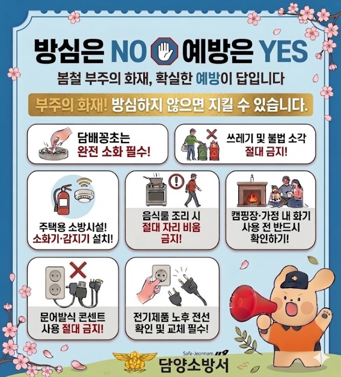 담양소방서(서장 이중희)는 건조하고 강한 바람이 잦은 봄철을 맞아 부주의로 인한 화재를 예방하고 지역 주민의 안전의식을 높이기 위해 ‘봄철 부주의 화재예방 안전수칙’ 홍보에 나섰다고 밝혔다.